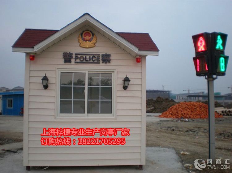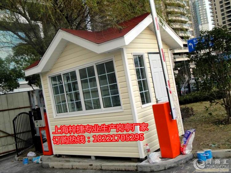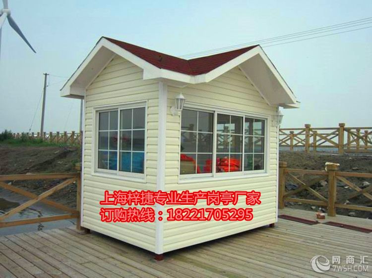 PVC挂板岗亭 主要材料: 【支撑柱】:采用80*80*2.0mm镀锌管立柱焊接而成 【墙 体】:PVC挂板为外墙/3mm铝塑板内墙,夹层细木工板 【门 窗】:铝合金玻璃移窗/不锈钢玻璃移窗/铝合金门 【内吊顶】:豪华PVC扣板 【外 顶】:1.2mm镀锌板焊接,SBS沥青防水卷材、沥青瓦 【底 座】:底层为角钢架,中间为木板 表层为防滑花纹铝地板 内部配置:岗亭内部暗敷线路,工作台面、配电源总开关(带防水盒) 节能吸顶灯,电源插座,空调插座,电话插座,照明开关 【备 注】:以上内部配置为基本配置,如需加装其他配件,需另加费用!