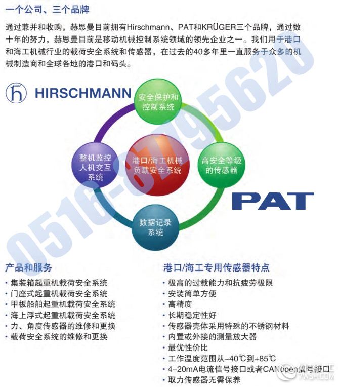 ★全球专业,规模大的移动工程机械控制系统的研发和制造商; ★世界各国起重机制造厂家(如LIEBHERR、DEMAG、GROVE、KIROW、徐工集团徐州重型机械厂、中联重科浦沅、长江起重机厂、三一重工、振华重工抚挖、柳工、华南船机等)配套商; ★PAT电子工厂为德国军方指定的部件制造商,机械加工厂为欧洲空中客车和阿里雅娜火箭的指定部件制造商; ★全球市场占有率,超过70% ; ★国内市场占有率,超过80% ; ★国内863计划机群智能化控制系统承担者; ★起重力矩限制器国家标准《GB12602-2009》起草单位。
