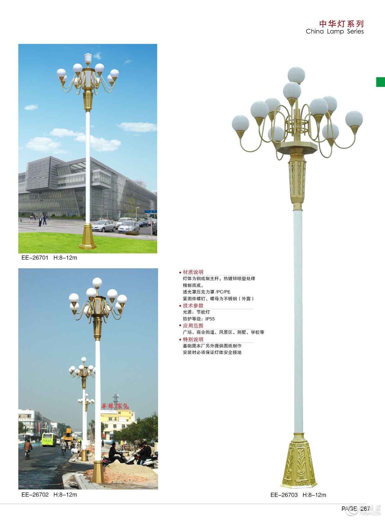 本公司专业生产:单双臂路灯、高杆灯、太阳能路灯、风光互补路灯、LED路灯、中华灯、球场灯、交通信号灯、交通标志杆、组合灯、草坪灯、地埋灯、投(泛)光灯、桃花灯、庭院灯、景观灯、仿古灯、中国结、异型灯及各种封闭式、敞开式照明灯具。灯杆用材可根据客户需求选择不锈钢、优质钢或铝铸件等。 中华灯—特点: