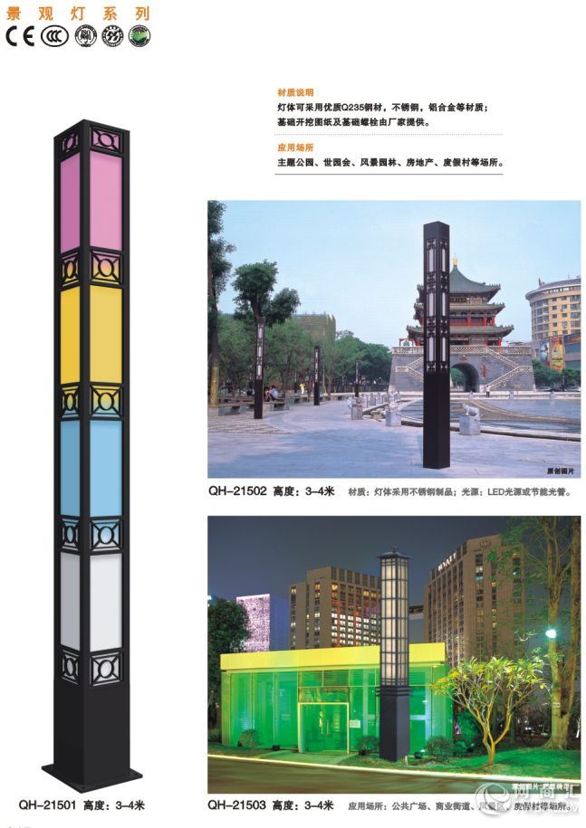材料说明:灯柱为不锈钢,铝材制品,(优质钢材,经热镀锌处理后),表面聚肪粉体涂装