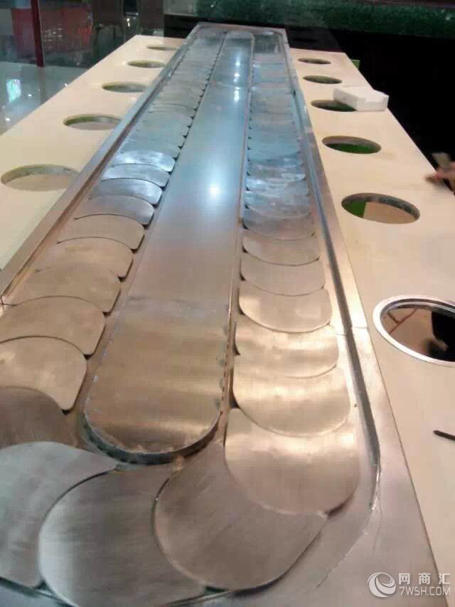 自助旋转寿司线是中国传统火锅借鉴日式回转寿司的一种新型餐饮方式。同回转寿司类似,将寿司食材放在容器里摆在运输带上,运输带围绕餐厅的座位而行,顾客可根据个人喜好来选择不同的食材。付款多为按位收费,顾客也可以另付费选择特殊食材。旋转寿司的运输带上除了火锅食材之外,还有其他小吃、水果、甜点、开水等。回转寿司店面装修通常比传统火锅更为时尚,而顾客也有了更多的选择性。食材放在运输带上的时间也相对较短,保证了食材的新鲜。通常在店内有集中的调味台和饮料机供顾客自行取用,调料种类有麻酱、沙茶酱、酱油、辣油、陈 等数十种。旋转寿司实现了传统餐厅的人力服务到科技自动服务的跨越,比传统火锅店更节省人力成本,但在前期更多的考虑运输带的设计和餐座的设计。 优点特色:1、 传动系统采用密封式设计,输送链条结构严谨,运行平稳,噪音几不可闻,耐磨片式组合链轮,可延长回转设备的使用寿命。 2、节省人力物力:食客在各自的座位上可随意选择摆放在输送带上的食品,无需服务员送上,本机以台架代替餐桌,可节省大量餐桌及台布。 3、餐点再旋转中运用明亮的灯光及输送带的移动让餐点变的更可口,提高食客的食欲。 4、回转设备可以让食客清楚选择想点的餐点,而不再只是看不到实际餐点的菜单。 5、点餐时食客不用再等待了;不用离开座位端盘取菜了,想吃多少就多少,不必担心吃不完或吃不够时还要再点餐一次。 6、单人单炉符合人们的卫生习惯。 7、具有两用的优点,冬天用在火锅,夏天用在寿司,只要用特制的不锈钢盖板封住餐桌上的炉孔即可成为寿司输送设备,体现经营寿司和火锅的乐趣,又便于客人在各自的座位上可随意选择摆放在输送带上的食品,无需服务员送上。 特点总结:输送链带运行平静,具有耐磨、低噪音、输送链带两链片间高度差小、输送导轨接驳位平整、无毛刺、设计合理、链带经久耐用。