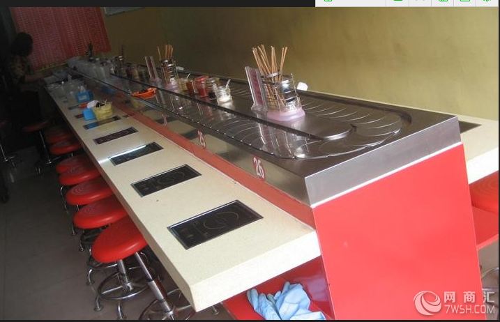 回转火锅设备 回转小火锅设备链板及链条均采用304磨沙面冲压而成,板厚1.8mm,宽度140mm,链条节距100mm,链条下部分导轨面板采用304锈钢镜面,板厚度为1.2mm,内部采用白色防摩尼龙垫条,旋转吧台,寿司料理,旋转火锅,自助火锅餐厅。下架采30mm*30mm*1.5的碳钢方管焊接而成,表面经过防锈处理,所有连接部分均采用标准件连接,便于移装。回转火锅设备 回转小火锅设备 适应了饮食界推陈出新,适应了现代人对饮食新奇的追求。不需要设大厨房,整个配制、加工过程,都由顾客在餐桌上自己完成,节省空间是其一优点; 不需要大型灶台和灶具,无需大厨,普通服务员无需培训就能操作,简单易操作是其优点之二; 回转火锅是一人一锅,即可根据顾客喜爱选择各色菜品又符合个人卫生习惯,绿色饮食回归自然是其优点之三;独特新颖的回转火锅设备工艺,配用现代高科技电磁炉具,没有明火,不存在安全隐患,没有丝毫油烟产生,环保、卫生是其优点之四。回转火锅设备 回转小火锅设备 是你从事餐饮火锅行业,日本料理,韩国料理必备前卫机械设备. 火锅新思维:创意经营主题突出新火锅新概念:一人一锅新鲜健康,新火锅新模式:简易管理大众客群,新火锅新设计:专业研发质量稳定,应用范围:自助火锅、中西式自助餐、寿司料理。为传统火锅带来新思维与新机遇,为自肋餐行业创造完全不同的经营模式,主要应用于一人一锅的自助火锅形式,符合现代人讲求卫生、自主、便捷的饮食诉求,推出后引起众多人士的关注,深受消费者及投资者的喜爱。所倡导的创意及欢乐的美食之旅,将传统的餐饮业和休闲娱乐完美的融合在一起,让用餐顾客一进到店内都能感受到欢乐及愉快的气氛,让您的餐厅与顾客的距离更为接近。