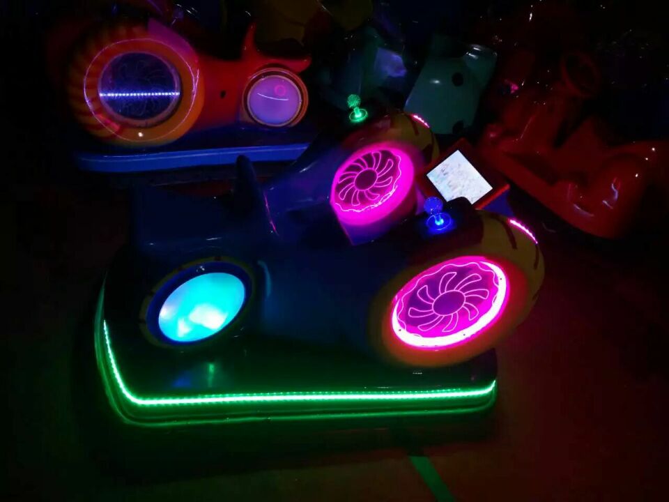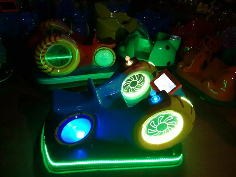 产品名称:蜗牛碰碰车 产品关键词:蜗牛碰碰车,风火轮碰碰车 国龙新款蜗牛碰碰车,造型可爱,灯光变幻,坚固耐用,可同时供大人小孩乘坐。可以自行调速,带遥控控制,玩家安心省事, 1岁左右的小孩也可以一起娱乐,亲子同乐,令宝宝在娱乐的同时照样享受着大人的呵护。 1.产品尺寸:长3250px,宽2000px,高1875px 2.电池参数:12v 20ah;配1充电器;可续航4个小时左右; 3.屏幕:8寸高清液晶屏幕; 可以不配屏幕 本产品款式新颖酷炫,带有绚丽的灯光,前后两个车轮的灯光都是自闪的并且是七彩的,非常吸引小朋友的眼球。 车头配有8寸液晶显示屏,可存储1000个视频。 车子行驶中按车上的按键会有滴滴的喇叭声,车子前面或者后面的位子都可以操作摇杆,方便控制车辆移动,达到很好的互动性。 本产品室内室外都可经营,对场地的要求不高;只要是平地,没有障碍物即可经营。 本品成员设定为两人,可以旋转,碰撞,带有定时,闪灯,方便管理。