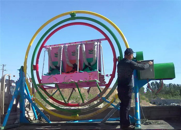 产品名称:三维太空环 产品关键词:三维太空环,太空环,三维环。 太空环由训练飞行员和宇航员的模拟装置演变而来的游乐设备。游客在其中360度任意旋转,速度时快时慢,它可使你体会到三维空间自由旋转的特殊感受,放松全身肌肉,既锻炼身体又趣味无穷。它是一项勇敢者的运动,也是绝无危险的运动,自由的三维旋转和飘然欲仙的意境,再加上绚丽多彩的外型,令人迷恋不已。 河南驻马店国龙游乐专利产品-无缝钢管三维太空环,无缝钢管三维太空环前翻后仰,360度左右前后旋转,刺激好玩。太空环采用纯无缝钢管制作。韧性和使用寿命是普通钢管无法相比的。现已发展到2座、4座、6座和8座,还有儿童太空环等一系列的型号,满足不同人群的需求。专业化的车间和技术人员,为您打造高质量产品。 设备占地面积12平方以内,220伏电压使用(儿童太空环免用电)。减速机和电机采用齿轮和链条传动,相比皮带和齿轮传动有效的改进了使用效果和性能。配有专业的音响效果和以秒为单位的定时器。配有四点式安全带、把手、脚扣和压杠,确保使用更安全。 三维太空环2座和4座尺寸318x250x6500px,6座尺寸368x290x7775px。 保修一年,没有易损件。