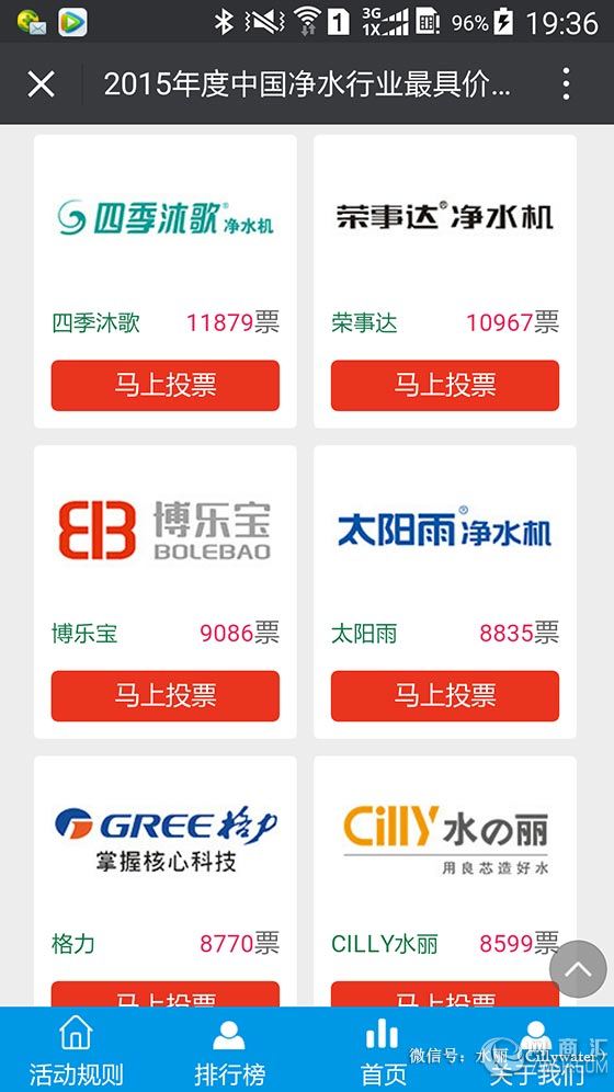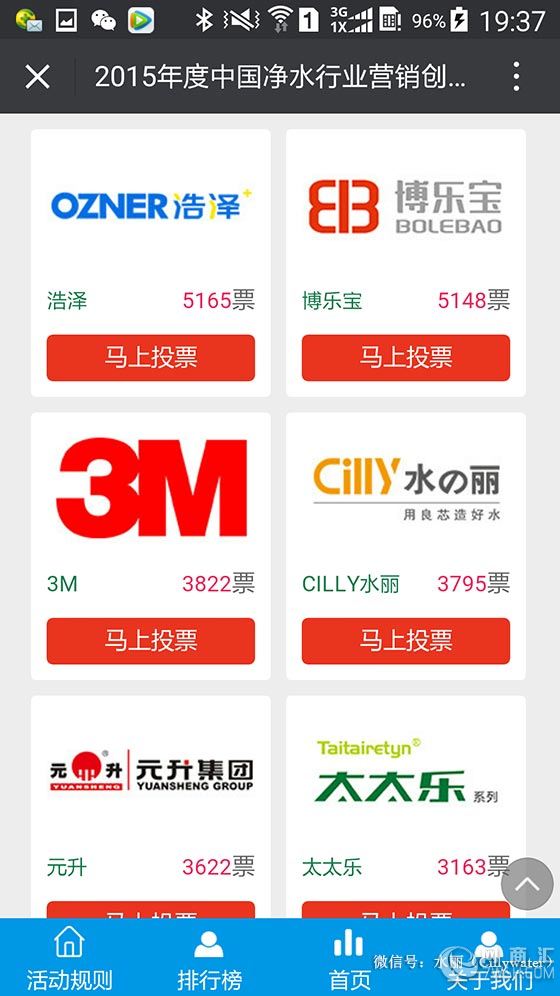 集权威性、专业性、创新性、公益性、持续性于一体,由新浪家居主办、中国质量检验协会净水设 备专业委员会协办的“2015第二届中国净水行业金鼎奖年度总评选网络投票”,历史一月之后于2015年 11月16日落下帷幕。据初步统计,1个月的网络投票时间,通过新浪家居专题页面和手机投票选页面参与 投票人次超过100万,华美完成阶段性使命。CILLY水の丽品牌经报名初审后即进入网络投票总评选阶段 ,共参评了“2015年度中国净水行业具价值品牌”“2015年全国畅销产品品牌奖”“2015年全国营销 创新奖”三个奖项,并且三个奖项在手机端截止16日晚间,全部进入前十强之列! 据悉,2015第二届中国净水行业品牌总评榜金鼎奖共设立了六个奖项,分别为“2015年度中国净水行业 十大影响力品牌”、“2015年度中国净水行业十大影响力人物”、“2015年度中国净水行业营销创新品 牌”、“2015年度中国净水行业畅销产品品牌”、“2015年度中国净水行业产品创新奖”、“2015年中 国净水行业优质配件供应商”。 自金鼎奖网络投票开始起,CILLY水丽净水即发动各方员工、渠道商、用户、合作伙伴、亲朋等各方资源 积极推动网络投票,并在公司水丽微信公众号定期推送投票信息和入口,每天在公司办公平台定时提醒 ,甚至在一些同学群里,老同学们也都采取积极地轮流值班的方式转发投票链接接口,提醒大家投票, 并将网络投票链接转发到各自的群和朋友圈中二次三次拉票。一个月的投票时间,这无疑成为了一道特 别的“风景”,成为水丽人和关心水丽人工作和生活的一部分,衷心感谢! 金鼎奖的评选同时还得到了中国家用电器研究院、中国质量认证中心、全国家用电器标准化委员会的指 导。作为战略合作伙伴,北京中怡康时代的参与更是为本届净水行业品牌评选提供了客观权威的数据支 持。此外,全国权威专家,百家媒体也一道共同见证和报道“全国净水行业金鼎奖年度总评选”活动。 “净水事业在近两年得到了空前的发展,但企业发展参差不齐,消费者面对繁杂的净水品牌无从选择, 净水行业的发展需要多权威机构的引导,也需要通过更为开放与自由的评选形式推出经得住市场检验的 龙头品牌,带动这个行业更好的发展。”中国质量检验协会净水设备专业委员会理事长邓瑞德表示,“ 通过全国净水行业金鼎奖年度总评选,进一步加强行业品牌影响力,为净水产品消费提过具价值参考 并引导消费,更广泛、深入地推动净水行业及品牌企业。”金鼎奖网络投票落幕,水丽净水器角逐三奖项均居前列