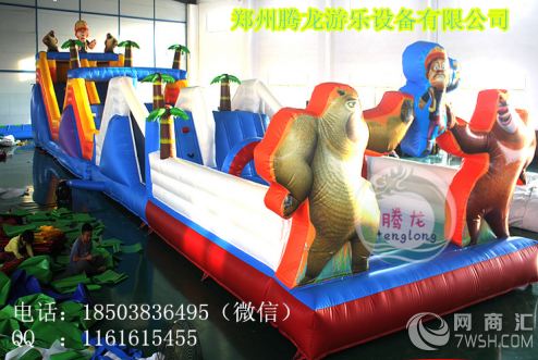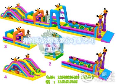 充气城堡采用专业的原材料供应商,0.48mm一等加厚,环保型PVC材料。专业的设计人员生产工艺:下料,缝纫(热合),粘整(美化),成品。尽可能多的使用双明线缝制,线迹均匀,针距控制在4.2到4.5mm之间。(能够大限度的减少漏气和增加缝纫部位的垃圾强度。)粘整刷胶宽度与粘条的宽度误差不超过正负12.5px。造型与大面连接处大限度地采用弧线结构。目的是使产品的受力均匀,增加产品的使用寿命。每两个造型之间和造型与护栏之间都有一定的安全距离。(1米)产品造型逼真,颜色搭配美观。而且能够充分保证游玩者的安全。 售后服务:终身提供维修用的胶水和角料,我公司售后服务人员将及时为您解决疑难问题,收到客户信息后,即时给予客户一个处理意见或技术指导不能即时处理的,将在24小时内与客户联系并根据实际情况提出处理意见。可使用八至十万人次左右。配送相应风机,胶水和修补材料。良好的品质,优质的服务,专业的技术,是我厂给每一位客户的郑重承诺。让您投资零风险! 充气玩具的使用说明及维护 1.将设备放置在平整地面上,设备下面好放一垫布(如地毡,塑料彩条布),然后将其展开。 2.找到设备的进风口,再与风机出风口相连接,并把风机口扎紧,再将备用的进风口用绳子扎紧。 3.把鼓风机接通电源,设备在5-10分钟内就会鼓起。 配套风机的安装: 1.选用国标1.5mm2-4 mm2电缆线若干米与风机相连接 ,另一端连接空气开关,并接上触电保护器。 2.使用前应先检查电源电压是否和铭牌相符,旋转方向是否正确。 3.应将机壳接一可靠的地线,并定期检查,把风机的进风口按上防护网,以免发生意外事故。 设备的保洁收藏: 1.切断电源,打开风机接口及排气口,排气时间一般在10-25分钟,余气要挤压。如果设备因为雨天进水,务必把水排净并晾。 2.做清洁处理,可使用洗衣粉将其污渍、油渍擦去,然后用清水擦洗干净,晒晾干即可。 3.将设备折叠,用底面着拦住正面,再用篷布将其盖好。 4.如果长期不用,把干净的设备折叠,打捆,包装好。仓储温度一般在-50~ 40摄氏度为宜。 5.风机应注意防潮、防腐蚀。气模设备要注意防鼠虫蛀咬。 1.为了保证您的设备达到正常的使用年限,在开机游玩时不能参加过多的孩子游玩。一般在气模上容纳2平方米一个孩子。 2.设施上的小造型起装饰作用,不能让孩子硬拉、硬撕以免损坏。 3.孩子游玩时,不能让孩子用坚硬物在设备上乱写乱画,以免损坏。 4.如遇设备破损,可在破损处和备用的PVC材料上都涂上专用胶,待胶5分钟后不粘手,将其粘合,适当挤压,数分钟便可以使用。 5.设备上的气压太软,检查有没有过多漏气,撕洞,或者停电;气压太硬,要把风机的进风口遮挡一点。 6.如大面积非正常使用损坏,厂方可以提供专业维修服务,或者直接寄回厂里进行维修。 温馨提示: 1.严禁幼儿游玩惊险项目。 2.避免幼儿与大龄儿童同时一块游玩,以免发生碰撞事故。 3.管理人员要安排游玩儿童一切要按游戏规则进行游玩,以免发生不测。 4.如遇大风(四级以上)雨、雪、雾、冰雹等天气,设备严禁在室 外露天使用,以免发生意外事故。充气玩具的使用说明及维护。