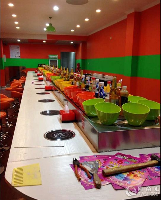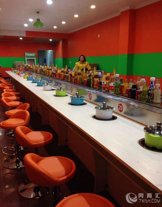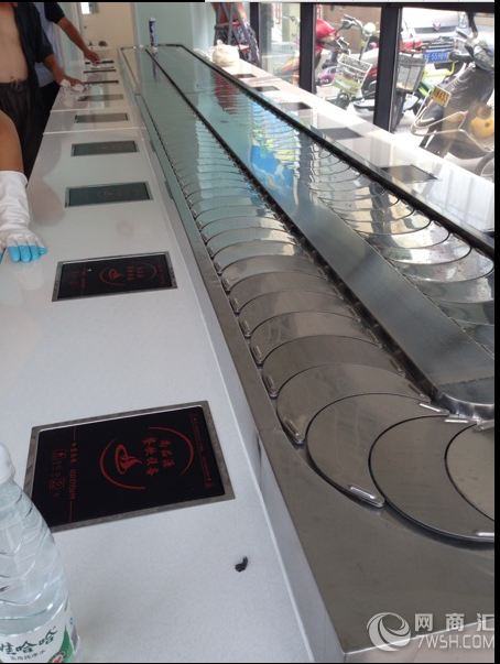 链板及链条均采用304磨沙面冲压而成,板厚1.8mm,宽度140mm,链条节距100mm,链条下部分导轨面板采用304锈钢镜面,板厚度为1.2mm,内部采用白色防摩尼龙垫条,旋转吧台,寿司料理,旋转火锅,自助火锅餐厅。下架采30mm*30mm*1.5的碳钢方管焊接而成,表面经过防锈处理,所有连接部分均采用标准件连接,便于移装。 旋转小火锅设备 火锅店旋转设备,适应了饮食界推陈出新,适应了现代人对饮食新奇的追求。 1、传动系统采用科学的密封式设计,设备运行安全平静,一人一锅的饮食模式符合食品卫生要求。 2、节省人力物力:客人在各自的座位上可随意选择摆放在输送带上的食品,无需服务员送上,而且设备有餐台,可节省大量餐桌及台布。事实证明,该设备是投资少,运行费用低、回报率高的餐饮设备。 3、餐点再旋转中运用明亮的灯光及输送带的移动让餐点变的更可口,大大 的提高客人的食欲。 4、回转火锅传送设备可以让客人清楚选择想点的餐点,而不再只是看不到实际餐点的菜单。 5、点餐时客人无需等待,更无需亲自端菜,所有好吃、新鲜的餐点都摆在眼前,想吃就直接取!想吃多少就多少,不必担心吃不完或吃不够时还要再点餐一次。 6、回转火锅传送设备区别于一般传统的餐厅,客人一多总是忙的团团转,而有了回转台人手不必多他可以帮你送餐点,现在又多了可以收餐具,帮商家节省了不少的人事及管理费用。 咸阳旋转小火锅设备 咸阳回转自助火锅设备