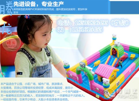 本产品适合于公园、小区广场、城市广场、旅游景点、大型商场、百货公司等投资经营、低成本高回报,是您小本创业投资的好项目。根据我们的调查和客户反应,一座充气城堡一天一般都有近五百元的收入,若放到好的地方,一天都有近千元的收入。一经投放市场,引来不少哄动,大批小本投资者奔走相告。
