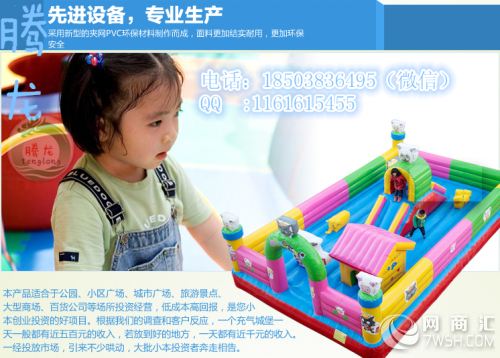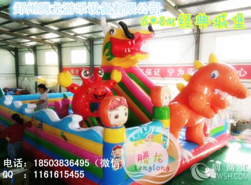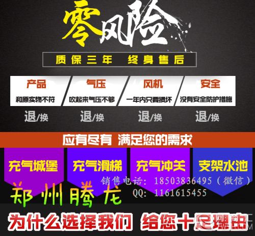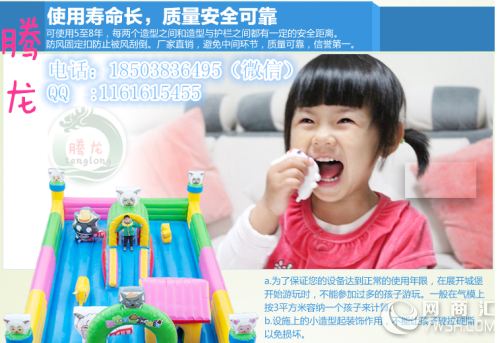 充气城堡采用专业的原材料供应商,0.48mm一等加厚,环保型PVC材料。专业的设计人员生产工艺:下料,缝纫(热合),粘整(美化),成品。尽可能多的使用双明线缝制,线迹均匀,针距控制在4.2到4.5mm之间。(能够大限度的减少漏气和增加缝纫部位的垃圾强度。)粘整刷胶宽度与粘条的宽度误差不超过正负12.5px。造型与大面连接处大限度地采用弧线结构。目的是使产品的受力均匀,增加产品的使用寿命。每两个造型之间和造型与护栏之间都有一定的安全距离。(1米)产品造型逼真,颜色搭配美观。而且能够充分保证游玩者的安全。 售后服务:终身提供维修用的胶水和角料,我公司售后服务人员将及时为您解决疑难问题,收到客户信息后,即时给予客户一个处理意见或技术指导不能即时处理的,将在24小时内与客户联系并根据实际情况提出处理意见。可使用八至十万人次左右。配送相应风机,胶水和修补材料。良好的品质,优质的服务,专业的技术,是我厂给每一位客户的郑重承诺。让您投资零风险! 水池滑梯 产品特点: 一款滑梯实现了三种从不同高度滑水的刺激,以彩虹绚丽的色彩做外表,体现了仿佛人从彩虹上滑下来的童话节界。可配1米支架水池或配充气水池。 就如雨后升起的彩虹桥一样,远观犹如人间仙境一般,让人充满奇炒的幻想,忍不住有想前去体验一番的冲动。三个滑道,有红、黄、蓝、紫四种颜色,犹如浑然天成,色彩柔和,及其结合卡通主题元素的喷画和造型,更吸引客户眼球,增加客户想玩的兴趣。 国际通用高质量柏拉图PVC夹网料,10年老厂,熟手车工,更好的控制产品工艺质量,产品质量好,更耐用,更好的结合卡通造型和配合充气泳池、支架水池的使用..55mm专用滑片料。也可以做成水滑梯,滑梯表面用粘胶技术贴合车缝线,使其不漏水,再用引水管引水到滑梯顶部,由上而下,滑梯口接水池,利用水泵做一个循环。 产品介绍: 充气滑梯,是属于滑梯系列中的一种。是由高强度PVC夹网布或更高的材料制成的充气城堡类玩具,由鼓风机充入气体膨胀成形供儿童娱乐的游乐设施。基本外形和组合滑梯等类似,孩子通过攀爬或通过特殊的通道后由滑梯上部滑下来,可心提高孩子们的意志和信心并能享受相应的喜悦。 充气水滑梯,是一种由PVC等不同材料制作而成,由鼓风机等吹气设备提前或运行中吹气造成设定滑梯造型的项目,主要辅以各种卡通造型,放置于公园、游乐场供孩子们玩乐。 产品优势: 好玩:此类新型充气滑梯设备改变了以往的坐坐、滑滑、转转的主动玩法,儿童可以发挥自己的想象主动地,发明性地去玩耍。 安全:充新型充气滑梯设备中很多品种具有惊险安慰的特点,但都有安全保障。 色彩鲜艳:设备五颜六色,色彩鲜艳夺目,采用进品颜料,不易褪色。 耐用:新型充气滑梯资料结实耐用,可玩八到十万人次左右(一般能使用三年) 结构合理:设备局部受力相对均匀,正常使用时,不会呈现撕裂现象。 可根据场地任意组合;广场,公园,体育场,俱乐部,商场内外均可营业。设备放气折叠后,体积很小,便于运输。 赚钱有道,收入可靠。 前程无忧:儿童是充气乐园的体验主题,消费群体稳定而且均具有持续消费动机。 市场无忧:占据儿童市场体验经济核心,顺应市场趋势,满足市场需求 质量无忧:充气趣味玩国所有娱乐设施均经质监局检验,同时公司提供保养方法及终身售后 创业无忧:公司提供经营指导,让创业者零经验也能够收获经营实力 发展无忧:公司根据市场需求,不断开发新产品,及时给客户推荐新款,让您有持久的经营竞争力 获利无忧:一次性投资,形成蝴蝶效应式收入增长,财源滚滚来。 多一点真诚,少一点套路。 郑州腾龙厂家直销 充气城堡 充气滑梯 水滑梯 充气蹦蹦床 充气水池 钢架水池等儿童游乐设备 品质保证 安全可靠 经营无忧。 欢迎您前来参观考察 厂址:二七区京广路南三环