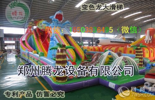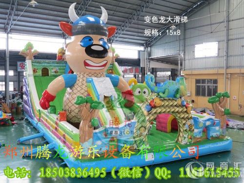气玩具是充分的利用薄膜材料的张拉力和薄膜内外的气压差制造的玩具.根据儿童喜欢在露天大自然中环境中游乐的特性而设计的,它内含滑梯、各式各样的动物造型,有丰富的娱乐项目,是公园和广场里儿童的理想玩具.它具有安全性、综合性、可观赏性、新颖性,色彩鲜明,经久耐用. 材料性能: 加网PVC制成.此材料为一种专业的充气布,耐寒性好,可达零下40度低温;阻燃性好,离明火5秒内自熄.由技术监督局检测结果显示此材料对皮肤无刺激性,无毒性对儿童完全没有损害。 适用范围: 产品体积小,便于搬运.广泛用于,游乐厂,广场公园,商场,社区,俱乐部,体育场等室内外场地. ?场地要求: 地面平坦,无尖利物. 充气玩具的使用寿命: 一般一件玩具可使用十万人次左右(四年),若注意使用环境,设备的正常操作及维护,可延长使用寿命. ?保养与维护: 此产品为连续充气形式,且送风量较大,为了使玩具有良好的弹性,此类玩具的某些部位是需漏气的,否则玩具过硬会影响娱乐效果.另外,若觉得玩具漏气量较大需要修复时,修复方法也很简单,就象修补自行车轮胎一样.只需要使用我公司提供的PVC材料和专用粘接剂即可修复.