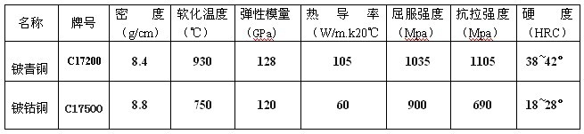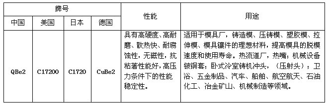 铍铜又称铍青铜,是铜合金中的“弹性之王”是一种析出硬化型合金,是机械性能,物理性能,化学性能及抗蚀性能良好结合的有色合金,经热处理(经固溶和时效处理后),具有与特殊钢相当的高强度极限,弹性极限,屈服极限和疲劳极限,同时又具备有高的导电率,导热率,高硬度和耐磨性,高的蠕变抗力及耐蚀性能。还具有良好的铸造性能,非磁性和冲击时无为花等性能。因此,广泛用于模具制造,电子电器,通讯仪器,航空航天,石油化工,冶金矿山,汽车家电,机械制造等领域。