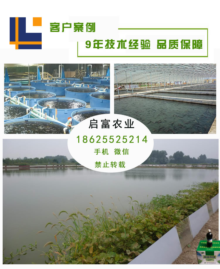 2、吞噬有害菌:启富鱼儿健em菌可以代替常规使用的石灰,漂白粉给鱼塘杀菌消毒,水产em菌种含有活性有益菌,可以吞噬水体中的有害菌,抑制细菌的滋生和繁衍,减少病原微生物,同时补充了水中有益菌菌群数量;