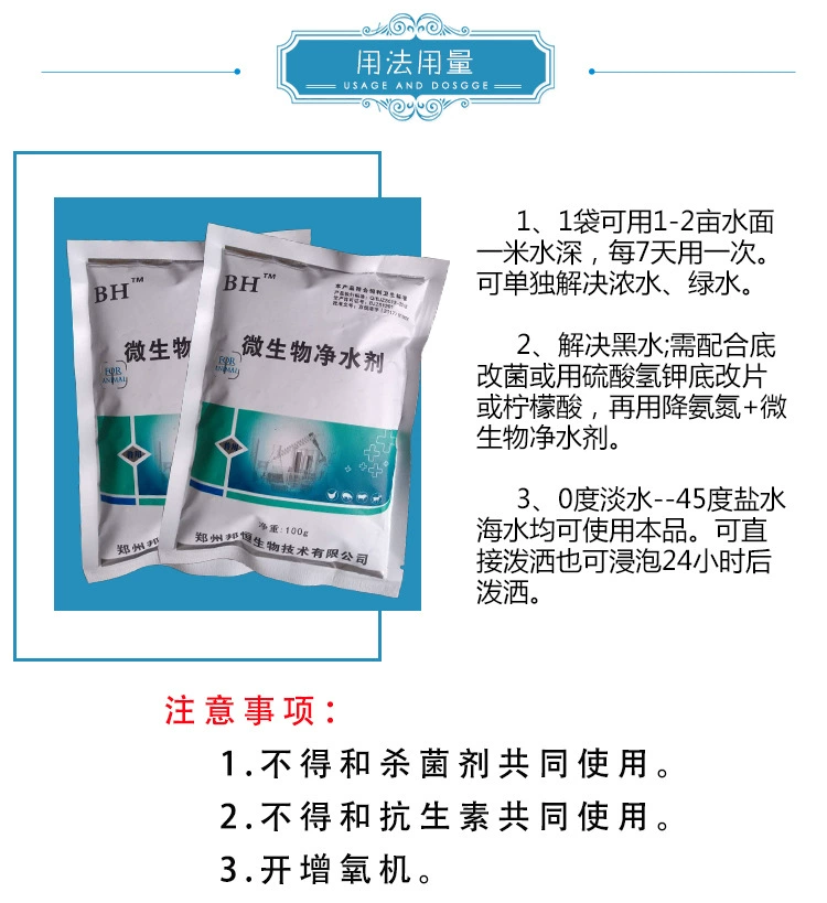 邦恒微生物净水剂的具体用法用量 用量:微生物净水剂兑清水混合均匀直接全塘泼洒 用量:平均水深1米,1袋微生物净水剂用1-2亩; 老绿水、水发黑:一个月使用2-3次,前两次间隔4-5天使用一次,水质严重的可适当增加使用次数和数量; 亚盐、氨氮超标:连续泼洒2次,中间间隔3-4天,以后每月可用1-2次维持水质。 邦恒微生物净水剂注意事项 1.不得和杀菌剂、抗-生素共同使用,建议开增氧机。 2.存放在通风、干燥、无污染的地方,避免与有毒、有害物质混合存放。