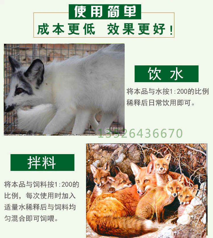 小贴士:  养殖菌液是纯生物制剂,直接喷洒在狐狸身上没有任何影响,还可以给狐狸消毒、皮毛提亮!  厂家咨询订购电话:135-2643-6670