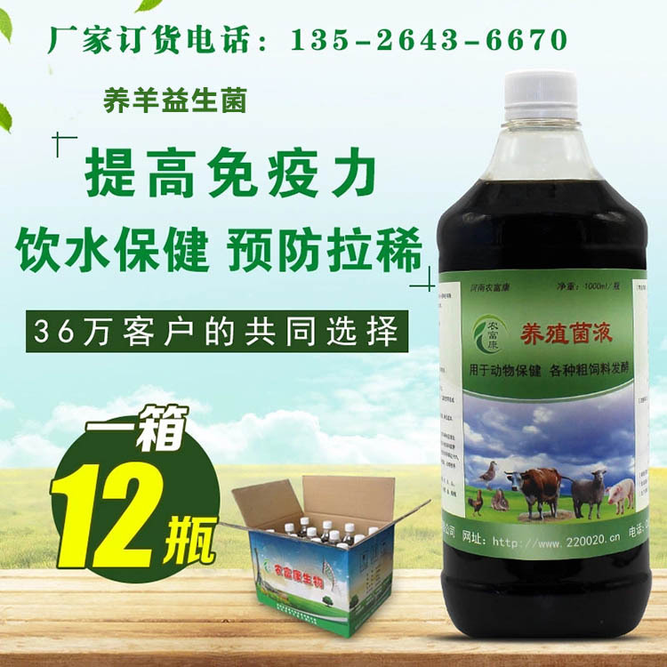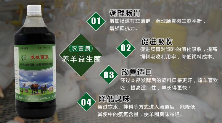 厂家咨询订购电话:135-2643-6670 农富康养殖菌液养羊的好处: 2.改善肠道功能,增加免疫力。 农富康养殖菌液养羊的使用方法: 注:配合使用效果更好