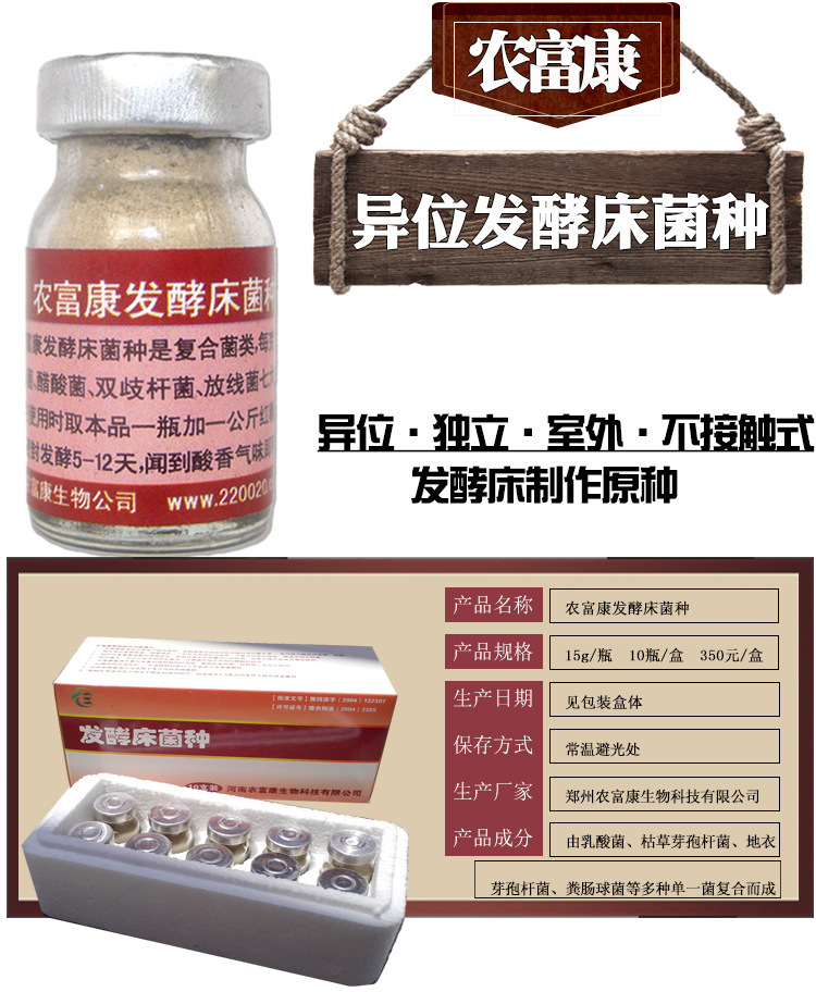 ,做成后可以连续使用3-4年。技术咨询电话:135-2643-6670 农富康发酵床菌种15g/瓶,10瓶/盒,350元