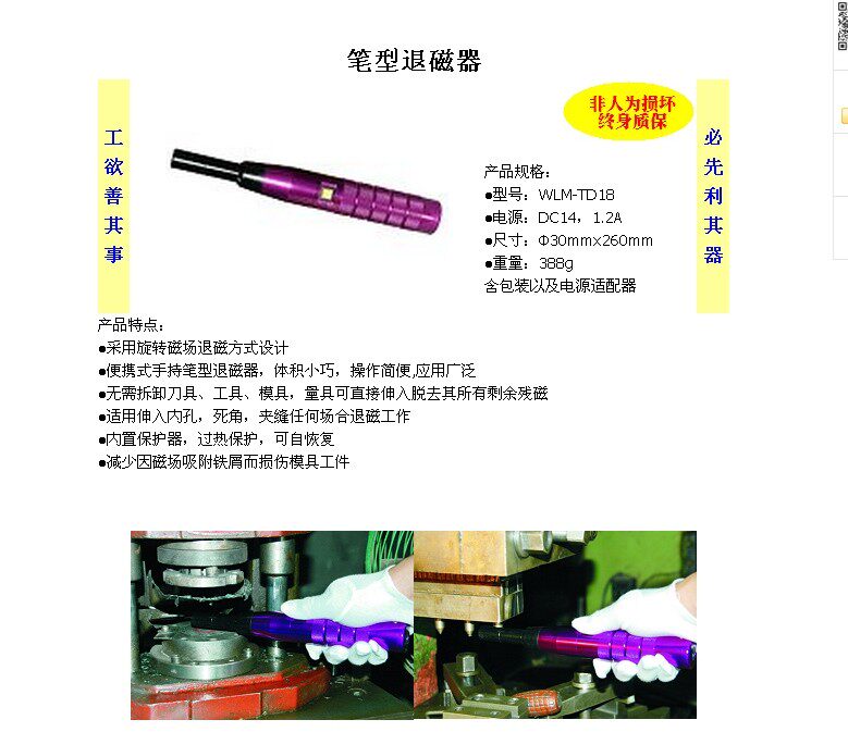 产品规格:●型号:WLM-TD18●电源:AC220V,0.8A●尺寸:有效工作段Φ18mmx40mm手持部分Φ30mmx260mm●重量:388g●使用频率:用二分钟 停四分钟产品特点:●采用旋转磁场退磁方式设计●内置保护器,过热保护,可自恢复●体积小巧,方便携带,应用广泛●适用于孔类,死角,夹缝等部位退磁