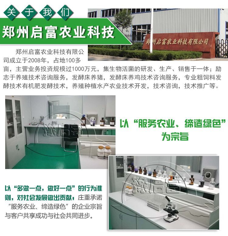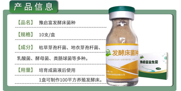 养鸡em发酵床菌种 微生物发酵床菌种 发酵床原菌种厂家 1、厂家实力:豫启富养鸡发酵床菌种厂家创建自2008年!十年磨一剑!历久弥新!近十年以来深受广大消费者喜爱!拥有自己独立的实验室、厂房、生产车间、销售部、技术部、发货部、售后部等一套完整,成熟的生产销售体系!厂家实力完胜各种三无厂家、小作坊等!是您值得信赖的合作伙伴! 2、提供制作与维护技术:上面我们也说到,想把养鸡发酵床做好,选择好的养鸡发酵床菌种只是一步,后期制作与维护技术也是非常重要的一步!豫启富厂家免费提供十年养鸡发酵床制作与维护技术!大部分客户之前都没有亲身制作发酵床的经验,但是通过技术人员的耐心讲解指导,制作与后期维护技术都掌握得相当牢固,都做出来优质的养殖发酵床! 3、产品效果:豫启富养鸡发酵床菌种上市十年,不断更新完善,多次升级,全国累计用户高达五十多万!厂家坚持使用一代原菌作为基础!为用户们提供更好的产品!让用户们有更好的使用体验!获得更高的经济效益! 4、产品价格:1盒10瓶,价格350元的发酵床菌种,可制作100平方的养殖发酵床!产品由厂家亲自研发生产,无任何中间商赚差价,价格透明!量大可优惠!代理更是享受较大的利润空间! 5、厂家售后服务:为了让用户享受到更好的服务,产品使用的效果更好,在您订购产品的同时,厂里发货部会在发货时附带一本完整的厂家技术资料!如使用过程中有任务技术问题,也可以随时咨询当时您所联系的销售人员!帮您解决所有产品使用过程中的技术问题!让您用的更放心!效果更好! 2、有益微生物菌参与:制作发酵床,需要发酵床菌种,这些有益菌存在于发酵床的垫料当中,鸡平时啄食发酵床上面的麦麸、发酵过的鸡粪等,会把部分有益菌带入肠道,有益菌进入肠道之后会在鸡的肠道内定丶值生长,有了这些有益菌保护动物肠道,鸡就不容易拉稀、发生肠道细菌性疾病! 3、环保低臭降氨气:上面我们说到,有益菌都存在于垫料之中,鸡在发酵床上拉出来的鸡屎鸡粪,会被有益菌发酵、分解,成为高效有机饲料,鸡的肠道内生长的有益菌,不仅可以保护鸡的肠道不拉稀、不生病,并且还有提高饲料消化吸收的能力,鸡消化吸收的好,排出的粪便里所含有的有机物就少,本身排出的鸡粪鸡屎臭味就会降低。 4、提高养殖效益:垫料中的有益菌进入动物肠道之后,可以促进肠道的消化吸收能力,肠道消化吸收的好,鸡长得就更快,会达到提前出栏的效果,完全节省了好几天的饲养成本。并且发酵床养出来的鸡无论肉质、蛋质都是要远远高于传统笼养、棚养、圈养的鸡!鸡拉出来的粪便以及垫料中含有的麦麸等物料经过有益菌的分解发酵,都可以转化为高蛋白饲料,所以发酵床养鸡平时饲喂只需要喂到8分饱即可。大大节省了饲料开支,省钱就是赚钱嘛!