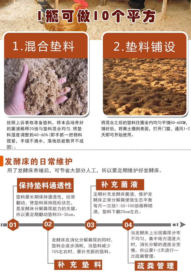 农富康发酵床养鸡菌种的使用方法: