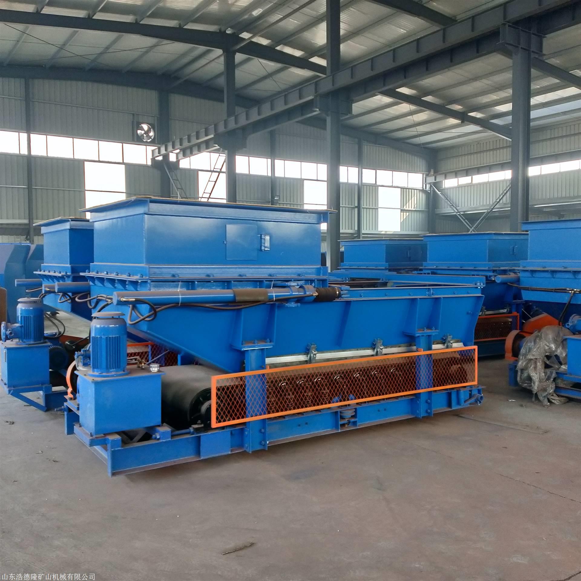 厂家销售给煤机 GLD矿用机械甲带式给料机 带式给料机简介: 带式给料机是环保、节能高效的新型产品,其特点是将传统的K型往复式给料机的间隙往复式给料变为连续输送式给料。 料仓内的物料经连接段进入导料槽落在钢丝胶带上,胶带静止时物料终靠内摩擦力而停止运动,在出料口形成一定角度的静止堆积;当驱动滚筒在外动力的驱动下开始旋转时,带动胶带运动,胶带带动其上的物料导向出料口,运行中的胶带在出料口卸料后转向回程,物料不断的从出料口排出,从而完成给料过程;二次密封装置对从导料槽和胶带之间间隙中漏出的物料提供密封;改变给料量,可通过调节转臂行星摩擦式无级变速机的调速手轮来改变输出轴转速,改变胶带运行速度的大小(高低),从而改变给料量;也可通过选配变频器,改变电动机转速,从而改变给料量。带式给料机广泛用于煤炭、冶金、电力等行业各种料仓的给料,为转动连续给料方式,带式给料机生产中用户根据需要不停机就可进行调节(手动调节或液压缸调节),使给料系统更能满足高效、节能、环保的要求,带式给料机是往复式给料机、振动给料机的更新换代产品。 我公司除生产标准带式给料机外,还生产非标准、加长型等带式给料机。 带式给料机组成结构 带式给料机为吊挂式给料机,带式给料机整机经由漏斗架悬挂固定在煤仓口部,其下安装箱体,在箱体下安装给料装置。带式给料机装置由驱动滚筒、缓冲托辊、改向滚筒、胶带、清扫器等组成。驱动装置由机械无极变速机经链条带动主动滚筒旋转,带式给料机煤流从两侧板围成的箱体出口流出。给料装置和驱动装置均安装在底架上。在箱体上,安有闸门装置和驱动手柄,用于带式给料机停机时关闭煤流。 带式给料机料仓内的物料经漏斗架进入箱体落在具有耐磨、防纵撕、控冲击能力的专用胶带上,当驱动滚筒在外动力的驱动下开始旋转时,带动胶带运动,胶带带动其上的物料导向出料口,运行中的胶带在出料口卸料后转向回程。物料不断的从出料口排除,从而完成给料过程。安装在改向滚筒处的清扫器,清扫粘结在胶带上的物料,以避免物料在返程侧的撒落。改变进料口的大小可通过调节闸门的开度来实现,改变给料量,可通过调节无极变速机的输出轴变速,来改变胶带运行速度的大小,从而改变给料量。改变给料量,也可通过选配变频器,改变电动机转速,从而改变给料量。带式给料机运行中,系统主要负荷均由滚动轴承支撑,运行阻力小,设备所需驱动功率小,系统各零部件工作寿命长。 带式给料机性能特点 1.带式给料机运行功率小、能量消耗少、经济性好; 2.带式给料机给料量大、稳定; 3.带式给料机动态调整、无级调速、调整方便; 4.带式给料机运行平稳、噪音小、保护环境; 5.带式给料机磨损小、维修量小、使用寿命长; 6.带式给料机零部件通用性强、安装维修方便;