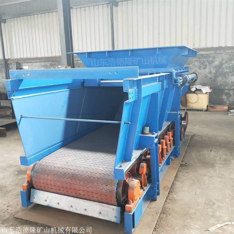 给料量大,200∽4000t/h,无级调速,根据具体工况可连续可调(手动或电气无极调速);环形甲带是专用的钢芯网式输送的新型甲带,采用16MN合金或45#钢,其结构编织密度大、耐磨、耐冲击、耐穿透能力强、弹性好等特点,具有防跑偏,防打 滑功能;克服了老式甲带阁层易夹煤而导致甲带与皮带脱离,出现打滑、断带等现象,导致维护劳动强度大、成本高;内衬胶带采用防跑偏结构,在环形带中间加铸 一道梯形筋,具有防跑偏的强效功能,大大克服了以往皮带跑偏的难题。