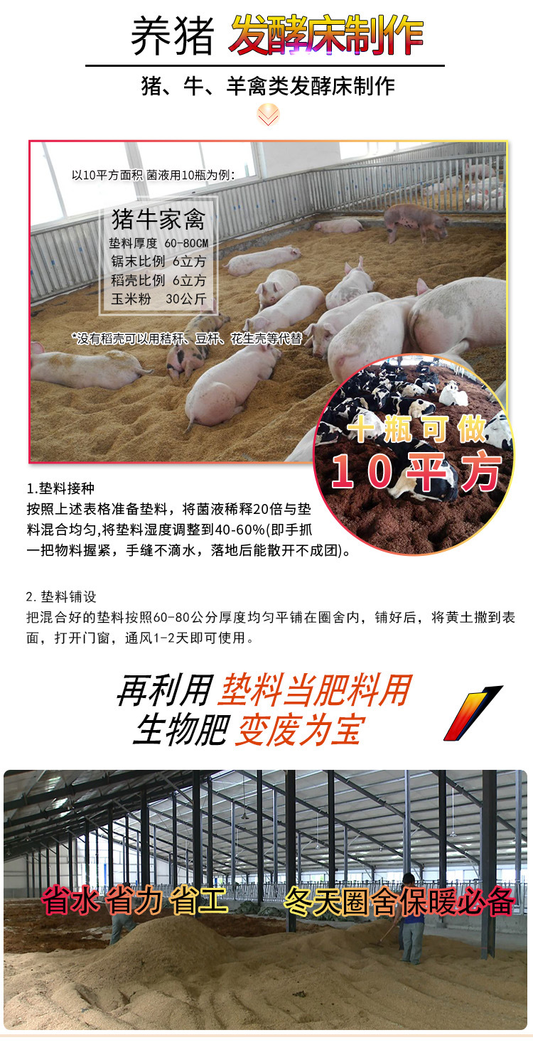 养猪发酵床可以变废为宝的一大神器 为什么养猪发酵床也称“懒汉养殖技术”?因为它极大的方便了养猪户,养过猪的都知道,猪圈总是有清理不完的猪粪,基本是刚清理冲刷干净的猪圈,没过多久就又变的满地都是猪粪,耗费了许多时间和精力,可是如果不清理猪粪的话,猪圈里猪粪长期堆积又会滋生很多的有害病菌,极大的增加了猪的发病率,同时猪粪的臭味到处弥漫,给自己和家人的生活带来了很多不便。养猪发酵床就是有机垫料和养猪发酵床菌液混合制成发酵床,然后将发酵床铺在猪圈内让猪在上面吃喝拉撒睡即可,猪排泄出来的粪便被垫料掩埋,猪粪尿经微生物菌的发酵后,得到充分的分解和转化。是实现养猪无排放、无污染、无臭气,彻底解决规模养猪场的环境污染问题的一种养殖方式,所以又称“懒汉养殖技术” 同时发酵床要想正常工作,需要靠发酵床上的有益菌不断繁殖来完成。而菌群喜欢生长在湿润的环境中。市面上有些发酵菌,起初是处于休眠状态,当猪生活在上面,有粪尿排放后,才开始慢慢启动发酵,分解粪尿速度慢,菌的活性弱,,慢慢启动发酵,分解粪尿速度慢,菌的活性弱,工作能力下降,使用寿命短。而启富的养猪发酵床菌种,先用红糖水给予有益菌大量繁殖的条件,使有益菌迅速繁殖,不断递增菌群数量,提高菌群的活性,随时都可以工作,效率高,使用时间长,只要维护好,实时补充有益菌,即可延长发酵床的使用年限。 启富发酵床菌种制作养猪发酵床的好处: 郑州启富公司专业生产发酵床菌种,历经10年,客户数量达30万之多,公司有自己的实验室,专家团队,生产车间,销售团队,售后服务等,全心全意服务每位客户,技术成熟,操作简单,全程提供免费技术指导(18566941330微信同号 胡先生)确保每位客户制作成功。 文章编码:185669413301129