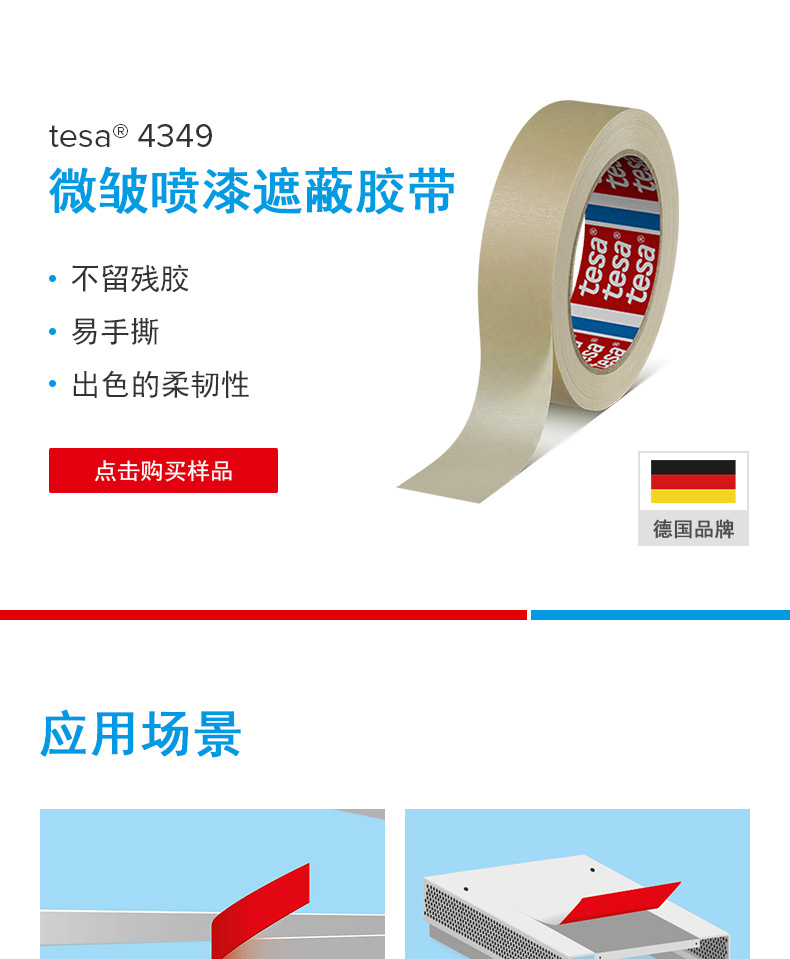 型号:TESA/德莎4349轻度皱纹通过遮蔽胶带适用于一般性的固定,密封,修补和轻量级封装应用,以及大面的遮蔽整只规格:1600mm*50m可分切,特殊规格形状可模切加工http://www.smdjn.com
