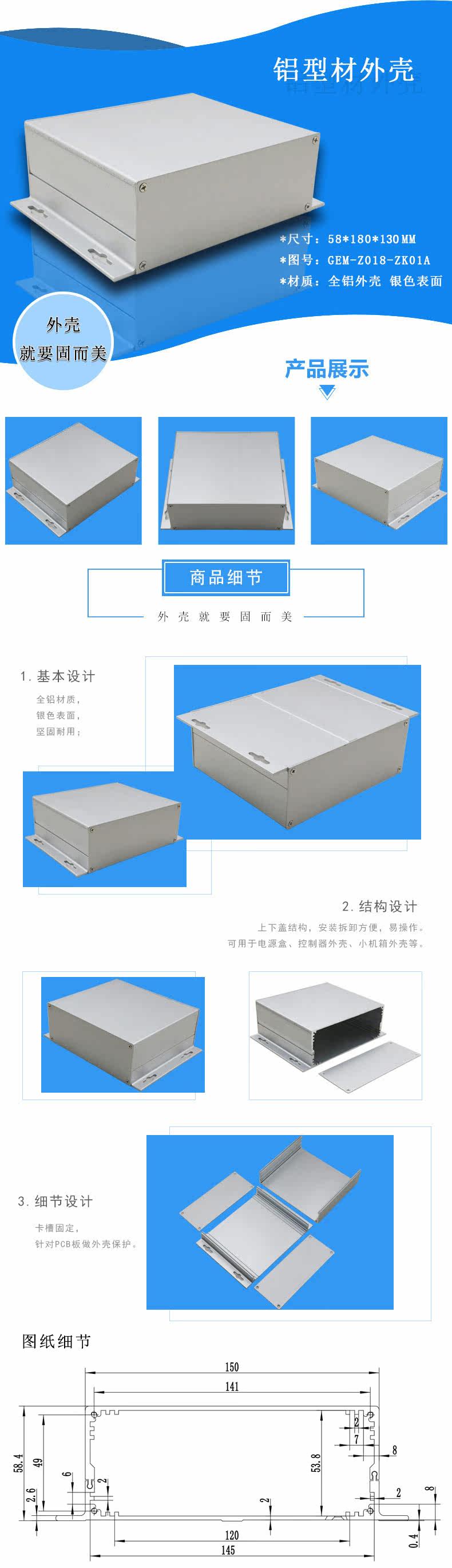 特点:1.全铝材质,银色表面,坚固耐用,卡槽固定,针对PCB板做外壳保护。