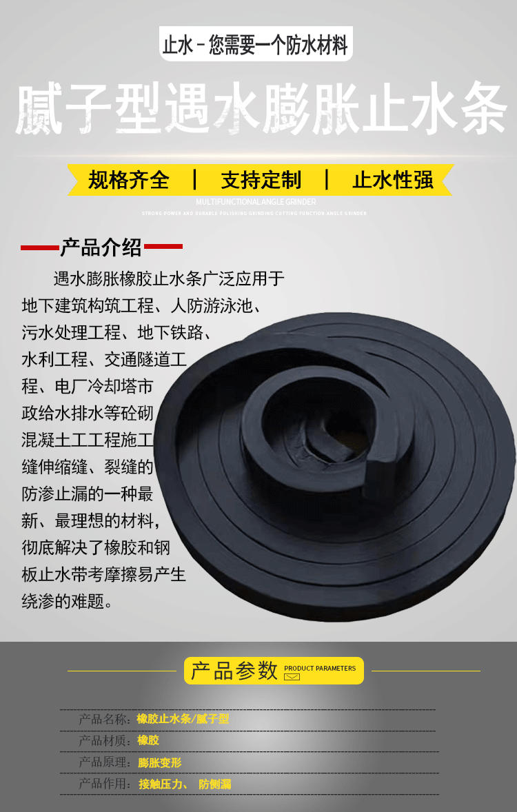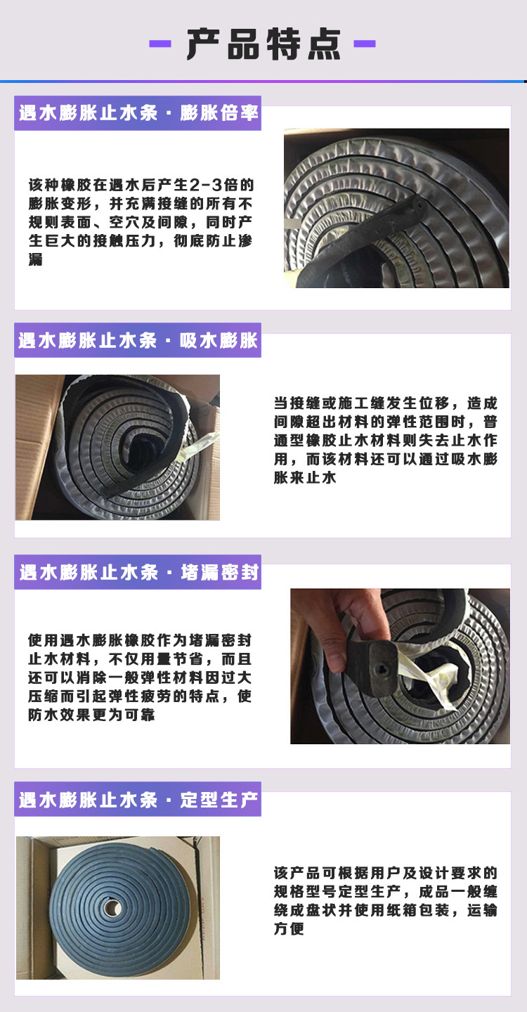 止水条是各种地下建筑构筑工程、水利工程、交通隧道工程、电厂冷却塔、市政给水排水等钢筋混凝土工程施工缝防渗止漏的的材料,彻底解决了橡胶和钢板止水带靠摩擦易产生绕渗的难题。