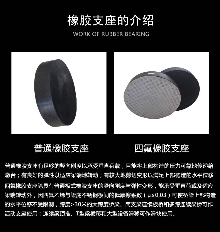 主要包括有:普通板式支座、四氟乙烯板式支座、 球冠板式橡胶支座三种产品