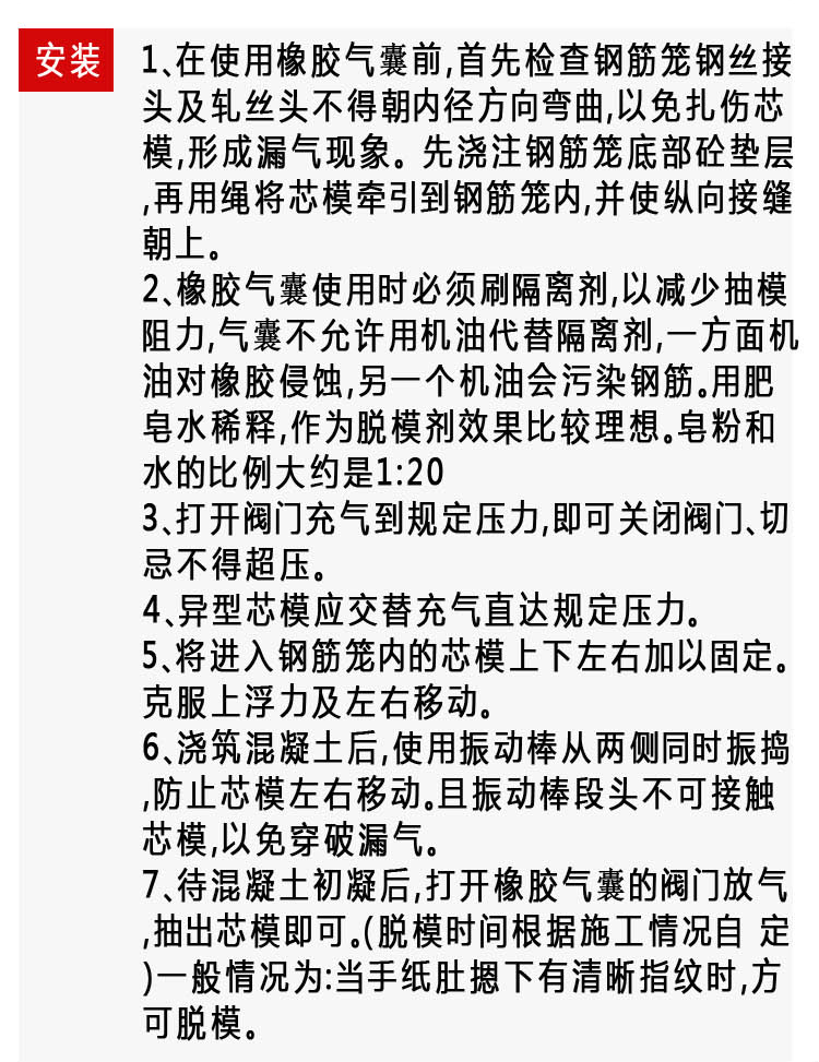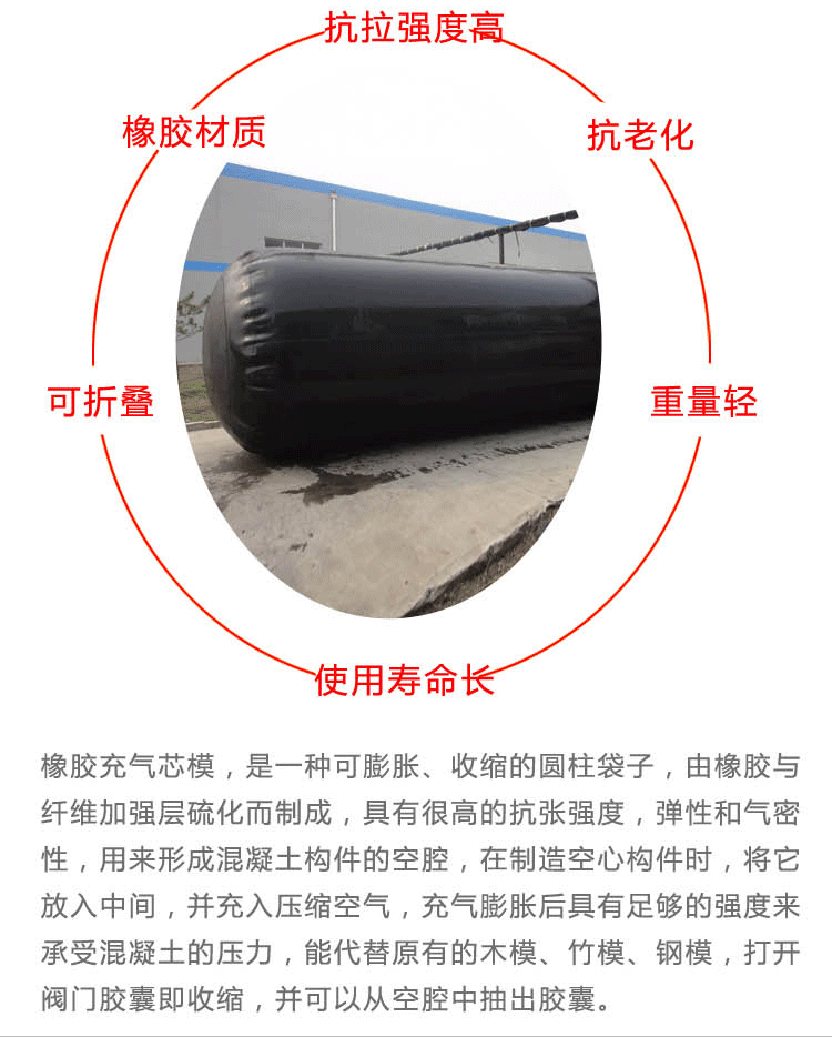 污水管道封堵 管道封堵橡胶气囊 管道堵漏气囊管道封堵气囊在管道中的作业时间应缩短,不高于12小时,污水中一般往往含有一些有机或无机的化学溶剂,长时间的浸泡或使气囊表面腐蚀乳化结膜使其强度降低,摩擦力减小,影响封堵施工。管道封堵气囊放入管道时应平行放入,避免卷曲,造成充气后折叠,以防气囊到时打不开造成局部受压过大,倍的额定工作压力和相应型号的管径条件下进行测为保证管道堵水气囊结构的强度我们采用三倍于管封器额定工作压力的安全系数管道堵水气囊6米长特制气压胶管在建筑楼层闭水试验中能承受2-6层楼水的自然压力管道堵水气囊特别适合对排水管道封后进行闭水试验,管道封堵气囊的弹性比较大,耐氧化和耐臭氧的能力比较差,比较容易老化,变质,所以,一定要避免管道封堵气囊和化学性的物质接触,这样会使它被氧化或变质。它的耐油性也不好,耐溶剂性也比较差,抗酸碱的腐蚀能力较低,所以,要尽量避免它与酸碱物品放在一起。管道封堵气囊也怕高温,所以,要尽量避免管道封堵气囊光照,要放在阴凉的地方,避免放在高温的地方。它的成本比较高。它可以被加工成很多东西,比如轮胎、电线电缆的绝缘层、胶管等,它的应用性广泛,用大型充气设备对此类气囊充气不大容易掌握充气的速度会导致气囊内部的链式结构在没有弹性还舒展开时瞬间被破坏从而导致破裂管道封堵气囊的主要作用是密封作用,管道封堵气囊,是橡胶和纤维织物等高分子合成材料经高温硫化工艺制成的一种多规格、多形状的用于管道、涵洞输水、排污、除淤维修的用橡胶产品,它可在不同管径、不同平面和不同位置上快速阻断水流,是地下管道进行输排水和淤污治理的理想工具 管道堵水气囊由增强天然橡胶制成,每一个管道堵水气囊在交付前,都会在1.5 倍的额定工作压力和相应型号的管径条件下进行测试为保证管道堵水气囊结构的强度,我们采用三倍于管封器额定工作压力的安全系数,市政管道封堵气囊保养与维修,管道堵水气囊由增强天然橡胶制成,每一个管道堵水气囊在交付前,都会在1.5倍的额定工作压力和相应型号的管径条件下进行测试。为保证管道堵水气囊结构的强度,我们采用三倍于管封器额定工作压力的安全系数。管道堵水气囊,由气囊、压力表、三通组成。在建筑楼层闭水试验中能承受2-6层楼水的自然压力。管道堵水气囊,特别适合对排水管道封后进行闭水试验、闭气试验、漏点查找、管道维修临时堵水等维护测试工作做气囊配件连接及漏气检查,当遇到水压比其充气压力稍大的管道时应对气囊进行人为的加固措施措施包括:气囊正面堵水时应在气囊的背部放几个沙包以防气囊在管道内移动用木杠竖起做成十字撑住管道壁以防气囊滑动当气囊反向堵水时 污水管道封堵 管道封堵橡胶气囊 管道堵漏气囊圆形充气芯模,气囊内模是一种降低本钱和加快施工进度的砼制品配套产品 特性: 1、设计科学合理:应用橡胶充气模,预制或现场浇筑出来的废品构件,都能满足设计请求,且操作简单,省工、省时、省材。 2、有良好的耐老化性能,运用寿命长: 本产品用全成橡胶、自然橡胶与增强层硫化后制成。既有很好的抗胀强度,又有弹性和柔韧性,所以能满足在各种工作条件下的运用。 3、适用温度普遍:在-15℃~95℃的范围内,材质没有变化。 4、为建筑现场施工轻型提供了有利条件:橡胶充气芯模,圆形充气芯模,气囊内模预应力空心混凝土构件,由于采用橡胶芯模,其重量比非预应力实心构件轻20%,因而减轻建筑物上部构造的重量,能够使桩基缩短,跨径增大,现场施工烦琐平安。 5、施工工艺烦琐、平安、卫生:运用橡胶芯模,只用少量简单工具,无需特殊工艺。只需将芯模入钢筋笼内,充气压力到达工作压力时,即浇筑混凝土时,待混凝土初凝时,将芯模放气抽出,即可完成废品构件的成型,不污染环境。