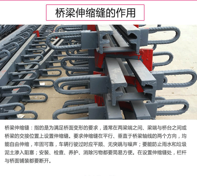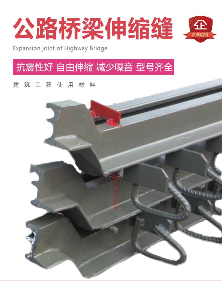 GQF-C80(CR),GQF-C40(NR),GQF-C60(NR),GQF-C80(NR),GQF-E60(CR),GQF-E60(CR),GQF-E60(CR),GQF-E40(NR),GQF-E60(NR),GQF-E80(NR),GQF-F60(CR),GQF-F60(CR),GQF-F60(CR),GQF-F400(NR),GQF-F60(NR)。利用橡胶在三相受力状态下具有流体的性质这一特点来实现大的转角,同时通过放置在中间支承钢板上的聚四氟乙烯板与不锈钢板之间相对运动时的低摩擦系数来实现梁的水平位移。 伸缩缝的选择,需要根据桥梁伸缩量的要求,桥面对伸缩缝平整美观的要求,车辆行驶的舒适度,桥梁结构的耐久性等都有要求。因此针对不同的情况设计出不同型号、性能、质量的伸缩缝,可以供人们选择。总会有合适的伸缩缝去匹配这座桥。 目前使用多的伸缩缝类型主要是:组合伸缩缝、板式橡胶伸缩缝、埋设式伸缩缝。 组合伸缩缝 1、大位移量伸缩缝 这种伸缩缝结构简单、伸缩性能好,具有机械和自然性能,在伸缩量大或小的时候, 只要换去支承梁的长度,增加或减少橡胶条和型钢, 就可组成不同伸缩量的伸缩装置, 目前这类伸缩装置种类较多, 但一般都存在一个主要问题, 即施工安装优劣直接影响到伸缩装置的使用。2、小位移量伸缩缝 这种伸缩装置是一种由两条钢梁嵌装橡胶条组成的机械系统, 粘结桥梁与伸缩装置的是由合成弹性体及混合填料组成的材料。3、埋入式伸缩缝(无缝伸缩缝) 该缝是以具有防水性能以及具有与其衔接铺装相同磨损性能的铺装材料作为主要材料的伸缩装置。 对于公路桥梁伸缩缝安装,施工单位根据图纸的工程单位宽度的阁楼缝缝混凝土切缝机,缝应注意保持道路切口垂直整个企平信,啃边现象。两个切料风镐凿,并在原有的伸缩缝填料缺口混凝土表面凿的缺口之间的差距及时清理和冲洗。请注意,并非缺口外的混凝土损伤。有了一个高压泵,以冲洗的凹槽和结构的骨折残留碎片。 建设单位要增强校正,仔细检查内嵌的增强,裂纹,损坏和丢失的现象时有发生。请按照下列步骤操作: 1公路桥梁伸缩缝的更换和安装由于过往车辆和铺设道路,工程机械和车辆滚动,嵌入式筋,裂缝和破碎的钢筋应该和及时性是焊接焊接修复或补充钢筋,理顺扭曲嵌入式筋,符合要求的嵌入式钢筋尺寸和安装设备的毛雷尔焊接要求。在该跨偏位梁体横隔板与反力架之间安装纠偏千斤顶,由纠偏千斤顶纵向推该跨偏位梁体,进而推动偏位联整联,推偏位联产生的反作用力通过第2步形成的受力整体传递到桥台和大地,D80伸缩缝定制A博爱梳齿形伸缩缝货真价实