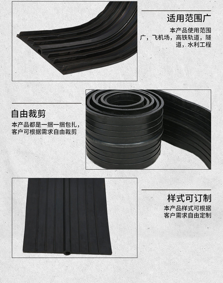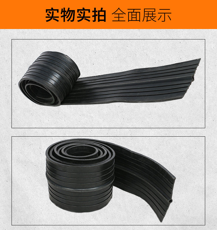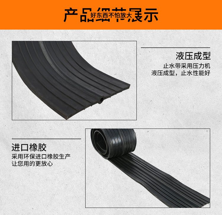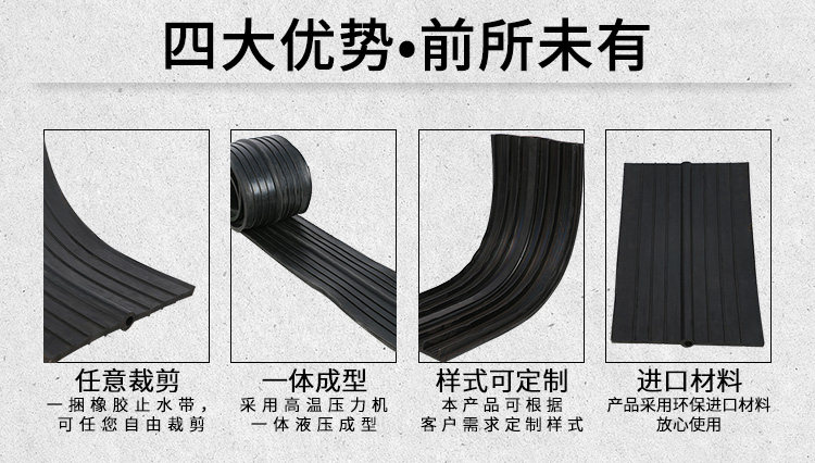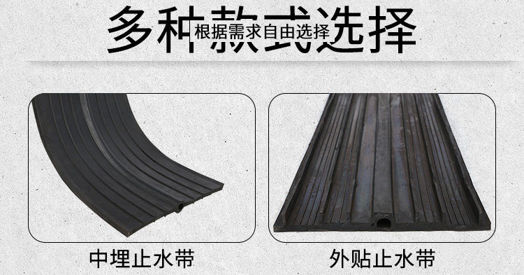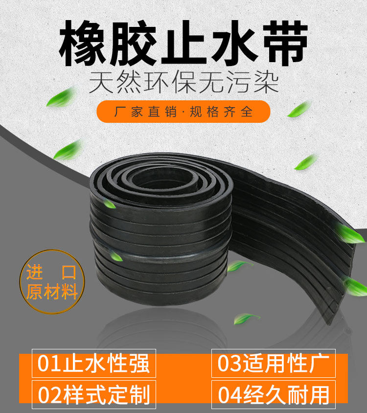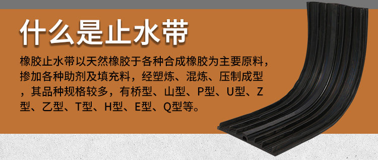 橡胶止水带和止水橡皮系以天然橡胶与各种合成橡胶为主要原料,掺加各种助剂及填充料,经塑炼、混炼、压制成型,其品种规格较多,有桥型、山型、P型、U型、Z型、乙型、T型、H型、E型、Q型等。根据使用情况又可分类为埋式橡胶止水带和背贴式橡胶止水带。该止水材料具有良好的弹性,耐磨性、耐老化性和抗撕裂性能,适应变形能力强、防水性能好,温度使用范围为-45℃- 60℃.当温度超过70℃,以及橡胶止水带受强烈的氧化作用或受油类等有机溶剂侵蚀时,均不得使用橡胶止水带。一般常在地下室外墙和后浇带施工时使用。 按型号可分为:CB型橡胶止水带(埋入式中间有孔型);CP型橡胶止水带(埋入式中间无孔型);EB型橡胶止水带(外贴式中间有孔型);EP型橡胶止水带(外贴式中间无孔型)。 按材质可分为:天然橡胶止水带,氯丁橡胶止水带,三元乙丙橡胶止水带。 中埋式橡胶止水带是橡胶止水带的主要种类之一,是其中一种止水带形式,通常又称中置式橡胶止水带或内埋式橡胶止水带,这是将橡胶止水带安装在混凝土变形缝、伸缩缝等混凝土内部设置的止水带,具有以止水带的材料弹性和结构形式来适应混凝土伸缩变形的能力。中埋式橡胶止水带利用橡胶本身具有的高弹性和压缩变形性的特性,在各种载荷下产生弹性变形,从而起到有效紧固密封,防止建筑构造的漏水、渗水及减震缓冲作用 腻子型遇水膨胀止水条又称腻子型遇水膨胀橡胶止水条,BW遇水膨胀止水条。是以十余种材料经密练、混练、挤制而成的具有遇水膨胀特性的条状密封材料。