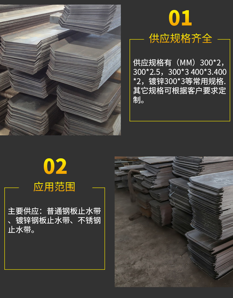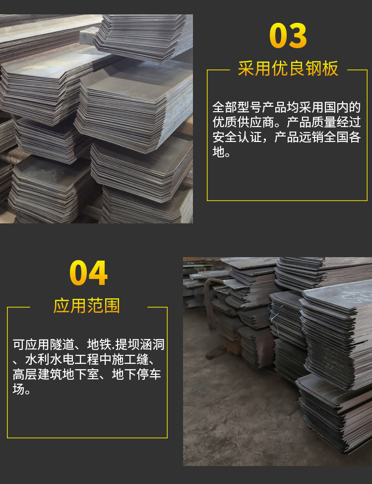 止水钢板从材质上来讲,通常叫做镀锌钢板止水带、金属钢板止水带、等别名。 止水钢板带主要是用于钢筋混凝土止水钢板结构、水坝及其它大型工程。如:隧道、地铁、堤坝、涵洞、水利水电工程中施工缝、高层建筑地下室、地下停车场等主要工程施工缝。钢板止水带在基建工程、地下设施、隧道、污水处理厂、水利、地铁等工程有重要作用