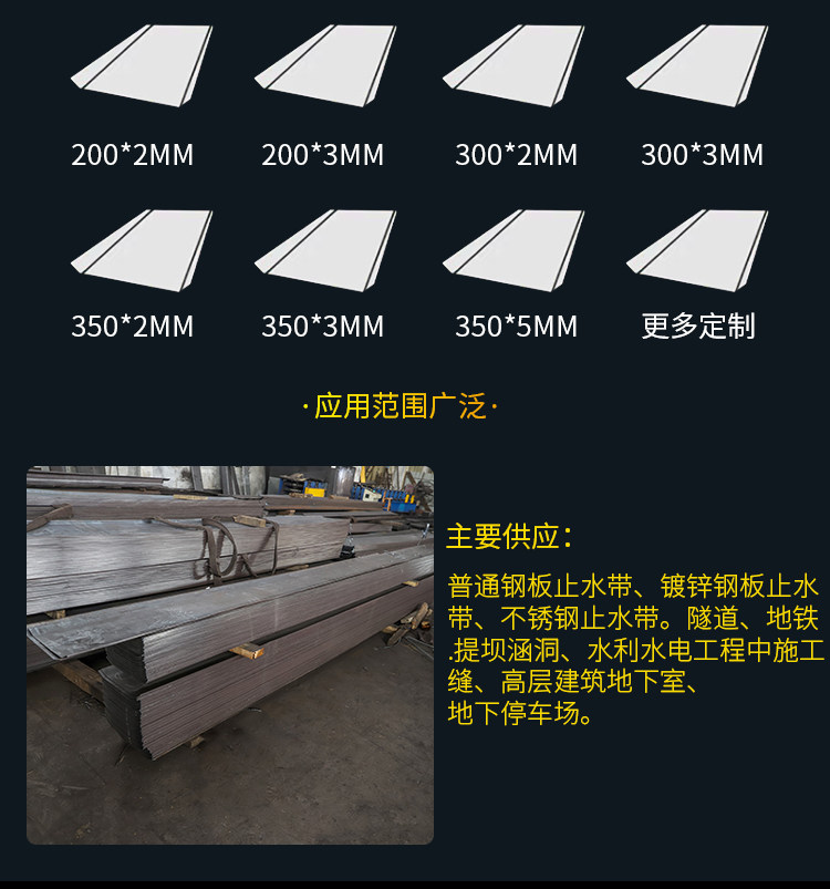 止水钢板带主要是用于钢筋混凝土二次现浇止水、水坝及其它大型工程。如:隧道、地铁、堤坝、涵洞、水利水电工程中施工缝、高层建筑地下室、地下停车场等主要工程施工缝。钢板止水带在基建工程、地下设施、隧道、污水处理厂、水利、地铁等工程有重要作用。