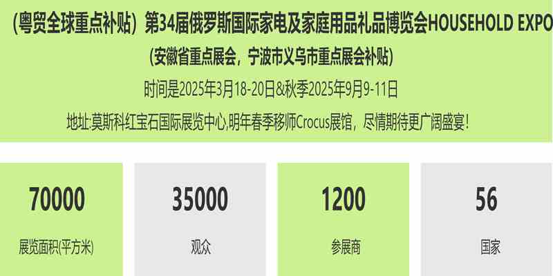 俄罗斯莫斯科家庭用品及家电展览会 HouseHold Expo2026 展会时间:2026年3月17-19日(春季) 9月8-10日(秋季) 展会地点:CrocusExpo 主办单位:MOKKA Expo集团 组展单位:广州明胜展览服务有限公司 展会概况: 俄罗斯莫斯科家庭用品及家用电器展览会(HouseHold)是俄罗斯Z大规模的家庭用品及家用电器展览会。由MOKKA Expo集团举办,得到俄罗斯联邦政府和工商联合会的大力支持。 市场动态: 2023年俄罗斯和中国的贸易额达到了2401亿美元,贸易额增长26.3%,创历史新高。中国对俄罗斯出口增长46.9%,总额约1109.7亿美元;俄罗斯商品进口增长12.7%,总额为1291.4亿美元。据中国海关总署6月7日发布的统计数据显示,2024年1-5月,中俄贸易额同比增长2.9%,达到965.092亿美元。2024年是中俄建交75周年,也是中俄文化年开启之年。中俄两国贸易具有互补性,贸易合作势头会更加强劲。在欧美制裁俄罗斯的国际大背景下,中俄两国的合作前景十分广阔。卢布和人民币可以直接结算,为中国开拓俄罗斯市场提供了更多便利。 上届回顾: 上届展会有来自全球56个国际及地区的1100家企业参展,展览面积达30000平方米,有25000人专业采购商进场采购洽谈。为世界各国的参展公司提供了优质国际贸易平台,向人们展示了全球市场的行业水平和潮流趋势。 展品范围: 1.家庭清洁、家居用品:浴室用具、清洁用具、各类纸巾、收纳储藏、家用五金、塑料、陶瓷、玻璃、金属制品等; 2.厨房用品、餐厨器皿:厨房用纸、各类餐具、炊具、烤盘、玻璃器皿、厨房家具、工具及配件等; 3.家用电器、家庭保健:各类小家电、吸尘器、取暖器、加湿器、水过滤、按摩、保健、个人护理用具等; 4.园艺用品、户外用品:花园、草坪工具、用品、装饰品、露营用品、野炊用品、铁艺及花园家具等; 5.装饰用品、节日用品:圣诞礼品、各类玩具、季节性饰品、家用纺织品、家居饰品、灯具和灯饰、各类工艺礼品等。 2026年明胜展览组展的全球家电电子通讯照明灯饰玩具礼品家居用品展览会 1月6-9日 美国拉斯维加斯国际消费电子展览会(CES) 1月12-14日 中东迪拜城市建筑及商业照明展览会 1月11-14日 香港国际玩具展览会 1月11-14日 香港婴儿用品展览会 1月29-2月2日 德国法兰克福消费品及礼品展览会 3月8-13日 德国法兰克福照明及建筑电气展览会(Light Building) 3月19-22日 美国芝加哥礼品家庭用品展览会 3月17-19日 俄罗斯莫斯科家庭用品及家电展览会(HouseHold) 3月31-4月3日 俄罗斯国际家居全品类消费品博览会(MosHome) 4月7-10日 俄罗斯国际消费电子电器展览会(ICEE) 4月13-16日 香港春季电子展览会 4月15-5月5日 中国进出口商品交易会(CantonFair) 4月20-23日 香港春季灯饰展览会 4月27-30日 香港礼品及赠品展览会 4月27-30日 香港时尚家品家纺展览会 4月27-30日 香港时装节 5月19-21日 波兰消费电子家电展览会(ElectronicsShow) 6月2-5日 台北国际电脑展(Computex) 6月15-17日 墨西哥消费电子家电展览会 6月22-25日 巴西消费电子及家电展览会(EletrolarShow) 7月15-17日 泰国礼品玩具及家居用品展览会(MEGASHOWBangkok) 7月15-17日 泰国曼谷消费电子及家电展览会(MEGAELECTRONICS) 7月15-17日 泰国曼谷照明灯饰展览会(MEGALIGHTING) 8月4-7日 美国拉斯维加斯消费品及礼品博览会(ASD) 9月4-8日 德国柏林消费电子及家电展览会(IFA) 9月1-5日 香港钟表展览会 9月3-5日 日本东京礼品消费品展览会(Tokyo Gift Show) 9月8-10日 俄罗斯莫斯科家庭用品及家电展览会(HouseHold) 9月17-20日 巴西国际照明灯饰展览会 9月19-22日 土耳其国际家庭用品礼品及家用电器展览会 9月18-21日 俄罗斯国际照明展览会 10月13-16日 香港秋季电子展览会 10月13-16日 香港电子组件及生产技术展览会 10月13-15日 中东迪拜礼品及时尚家品展览会(Gift&Lifestyle Middle East) 10月15-11月4日 中国进出口商品交易会(CantonFair) 10月20-23日 10月27-29日 香港玩具礼品展及家居用品展览会(MEGA SHOW) 10月22-25日 韩国国际电子展览会(KES) 10月27-30日 香港秋季灯饰展览会 10月26-29日 香港户外及科技照明博览会 11月5-7日 香港眼镜展览会 11月6-8日 中亚国际照明及智慧城市技术展览会 11月10-13日 德国慕尼黑电子元器件展览会(Electronica) 11月20-22日 墨西哥国际家居消费品博览会(MexiHome) 11月29-12月1日 加拿大建筑照明展览会 12月7-11日 中东迪拜国际通讯及消费电子信息展(GITEX) 明胜国际展览(MSE)-25年海外展览会及广交会优z服务商。专业专注值得信赖!欢迎订展! 中国组展: 明胜国际展览(MSE) 广州明胜展览服务有限公司 明君先生13711201610.13352874970